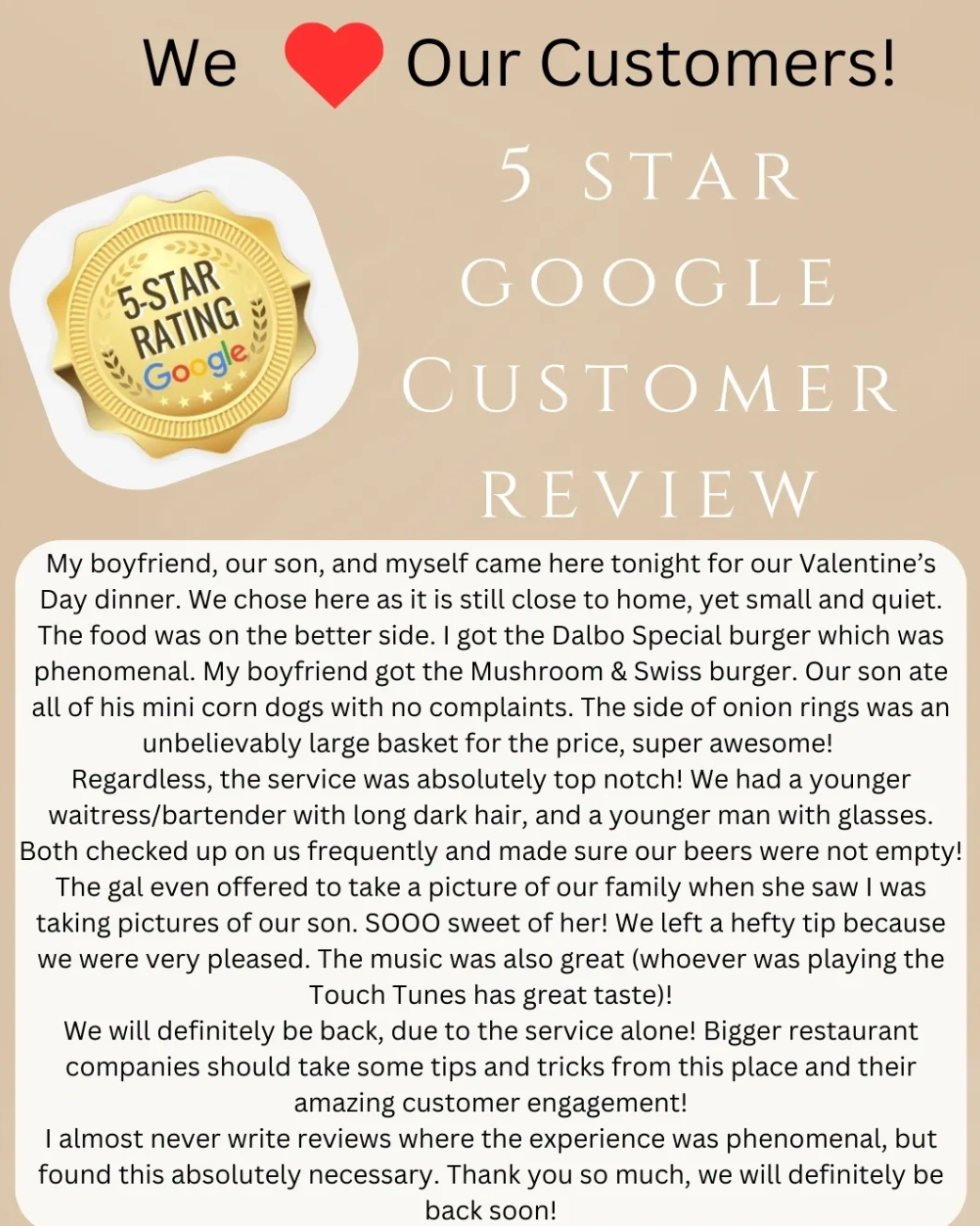 In 1915, Al Henshel shot an eagle and had it stuffed. This eagle then sat on a shelf in the pool hall collecting dust, thus the pool hall received its name - The Dusty Eagle Bar & Grill. The Dusty Eagle Bar & Grill is the second oldest establishment in Dalbo.