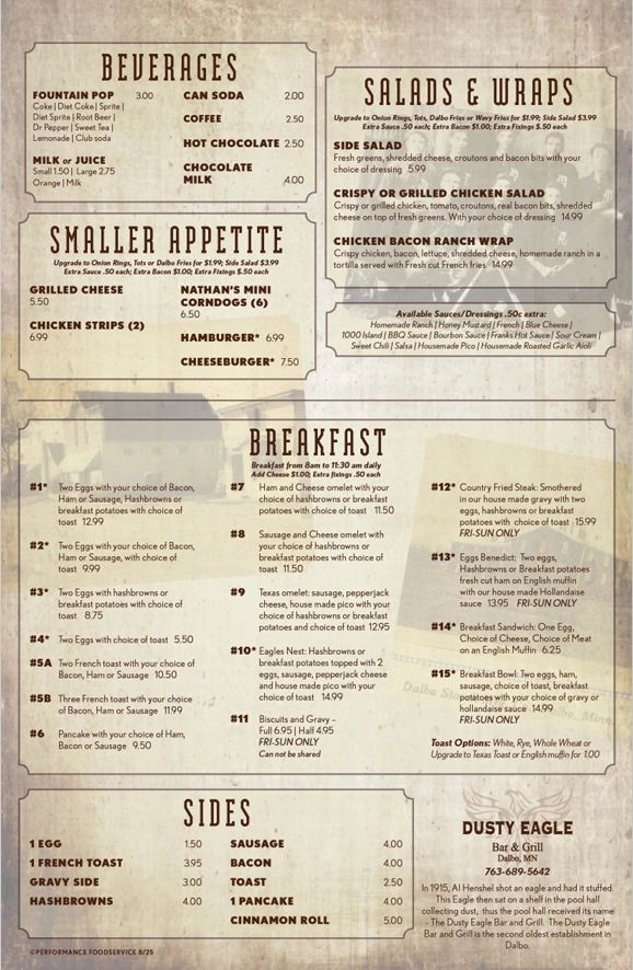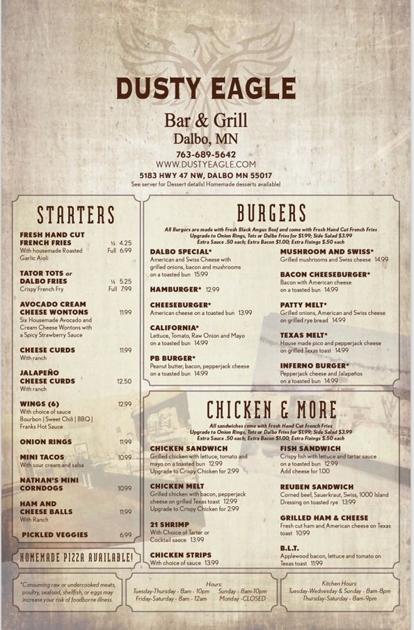 Come join us for great food, drinks, and a fun atmosphere at The Dusty Eagle Bar and Grill. Our menu features a variety of delicious options, including burgers, sandwiches, salads, and more. We also have a wide selection of beers, cocktails, and specialty drinks to choose from. Whether you're looking for a night out with friends or a family dinner, we've got you covered. Visit us today and see why The Dusty Eagle Bar and Grill is the place to be!